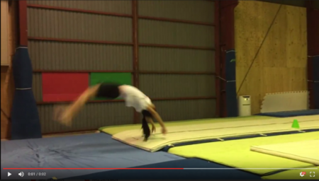 助走から勢いよく手をマットについて足を振り上げ、倒立を経過して前方へ回転して立ち上がる技